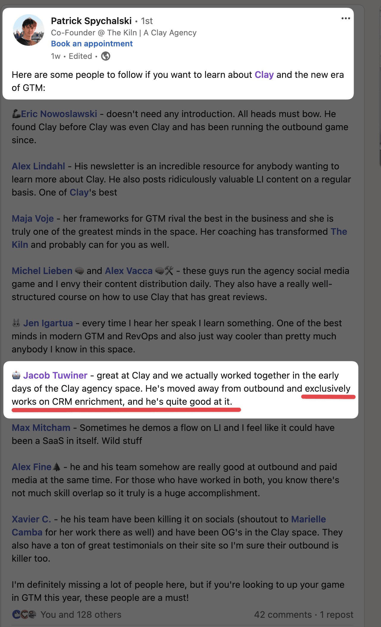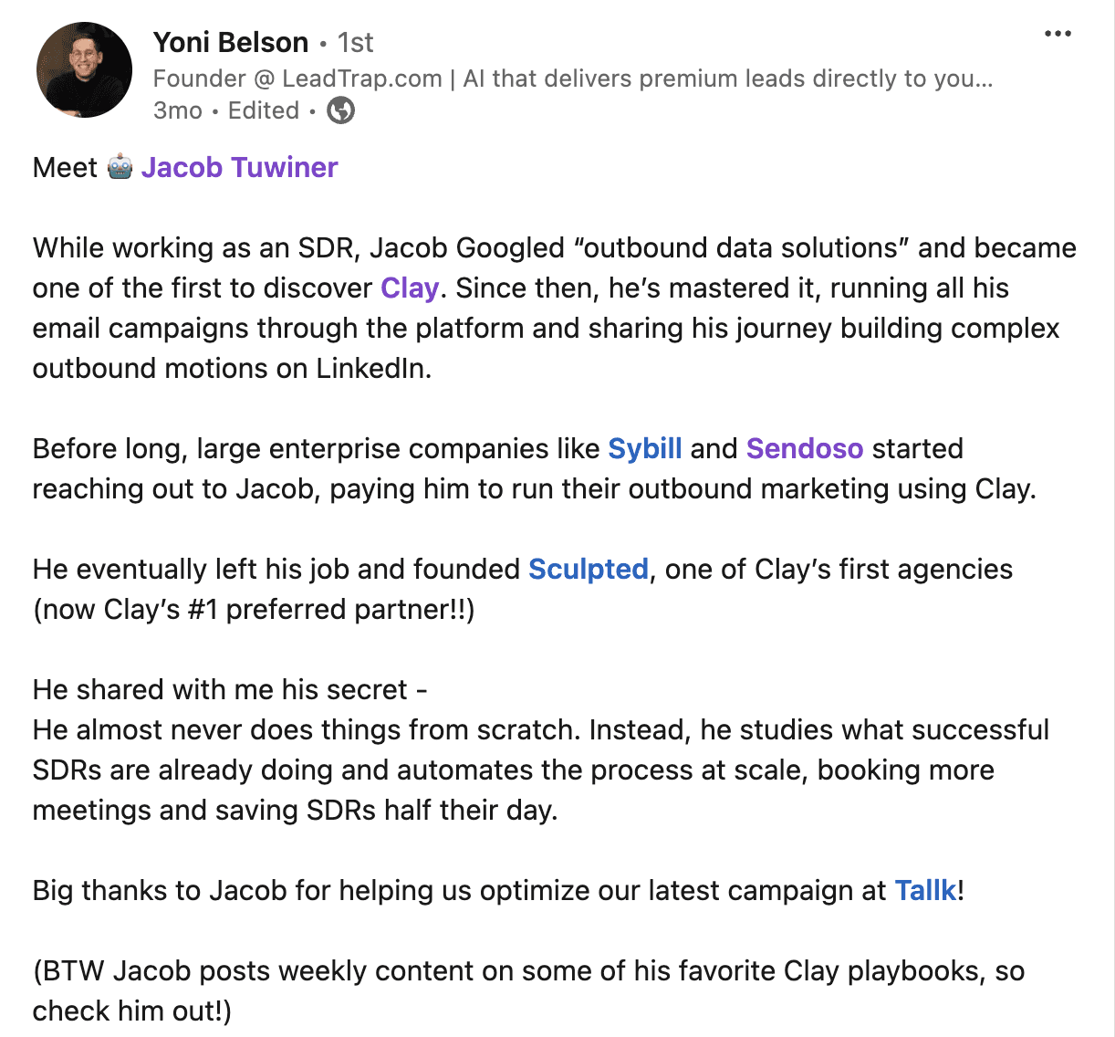 Among the first 100 Clay Experts, Sculpted’s founder brings real GTM experience - not just a certificate. He’s closed millions in sales and generated millions in pipeline for B2B SaaS brands like Sendoso.